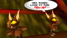 Barry is one of the bats that appear on the Barn Boys and Bat's Tower chapters in Conker's Bad Fur Day and Conker: Live & Reloaded. He appears on a cutscene with another bat talking with him about Conker. He and the other bats are later killed by Conker with a Flamethrower. Like most other characters in the game, he is very vulgar in his language, resorting to bleep censors. Oddly enough, it's censored despite his technically not speaking English.