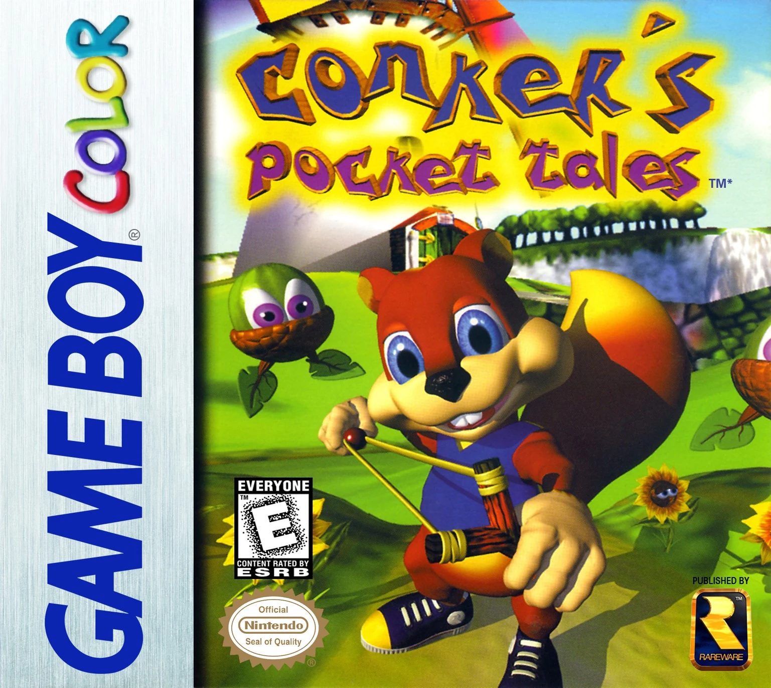 The cover of Conker's Pocket Tales shows Conker aiming with his Slingshot, while there are Evil Acorns, flowers and a Windmill seen around him. This image is derived from artwork from the cancelled Twelve Tales: Conker 64. Of all things shown on the cover of Conker's Pocket Tales it is only Conker, the Slingshot and the Windmill (though with a different look) that actually makes appearances in the game. Many of these things would later make appearances in Conker's Bad Fur Day but the Evil Acorns were ultimately scrapped.