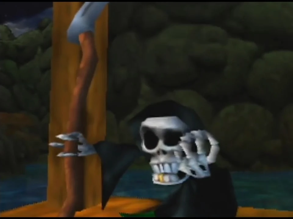 Conker walks through a tunnel which becomes caved in, blocking off his way home. He then proceeds forward to a lake (a village in L&R) where Gregg the Grim Reaper is. Gregg then gives Conker a shotgun and information of an old ancestor after he opens up the graveyard gates by pulling a lever in the tunnel. Conker must now shoot the zombies through their heads until enough are dead for Gregg to appear. Gregg opens the gate leading to the mansion, then Conker scales the narrow bendy pathway until he enters the spooky mansion.