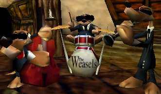 The Weasels Band are weasels, but, they can play instrument about, Drum, Symbol, Oboe, and the Guitar in The Cock and Plucker. The Weasels Band were from Conker's Bad Fur Day, and they were playing a band, because, they were playing a sound, that they can hear about Conker, Gregg the Grim Reaper, the squirrels, Bartender, and the Fire Imp. From Conker: Live & Reloaded, The Weasels Band are playing the instrument about, Drum, Symbol, Oboe and the Guitar and that can hearing Birdy, Gregg the Grim Reaper, the squirrels, Tedizs, Bartender, and Fire Imp; and they were playing doing the instrumental.